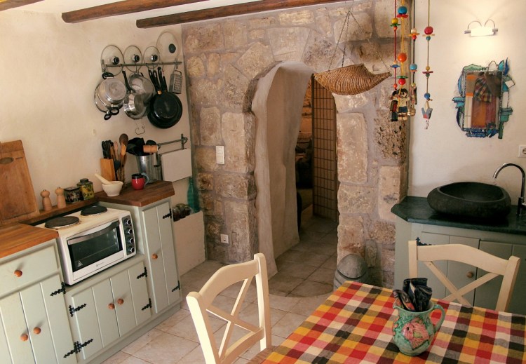 The kitchenette has wooden beams, a bespoke made kitchen where the sink is carved out of Italian granite.